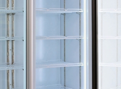 Ce refroidisseur arbore une finition blanche élégante et dispose de deux portes coulissantes pour un gain de place. Il est équipé de 8 étagères réglables, d’un thermostat numérique, d’un système de verrouillage, d’une porte à fermeture automatique, d’un éclairage LED. Pour faciliter son déplacement, il est monté sur quatre roulettes. Les vitrages sont en verre trempé de sécurité pour une robustesse accrue.