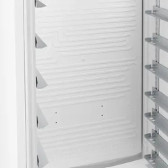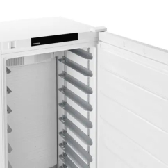 Avec une capacité de 496 litres et une température réglable de +1 °C à +15 °C, elle s’adapte facilement aux besoins de stockage. La circulation de l’air froid, assurée par un système de réfrigération dynamique, permet de maintenir une température homogène sur l’ensemble des niveaux. Grâce au dégivrage automatique, la formation de givre est limitée, ce qui facilite l’entretien au quotidien. Fonctionnant avec le réfrigérant R600a, l’appareil combine efficacité de refroidissement et impact environnemental réduit. Le pilotage de l'armoire s’effectue à l’aide d’un écran monochrome et de commandes tactiles, offrant un réglage simple et précis. Compatible avec les plaques de four Euronorme, elle facilite l’organisation et la manipulation des produits.