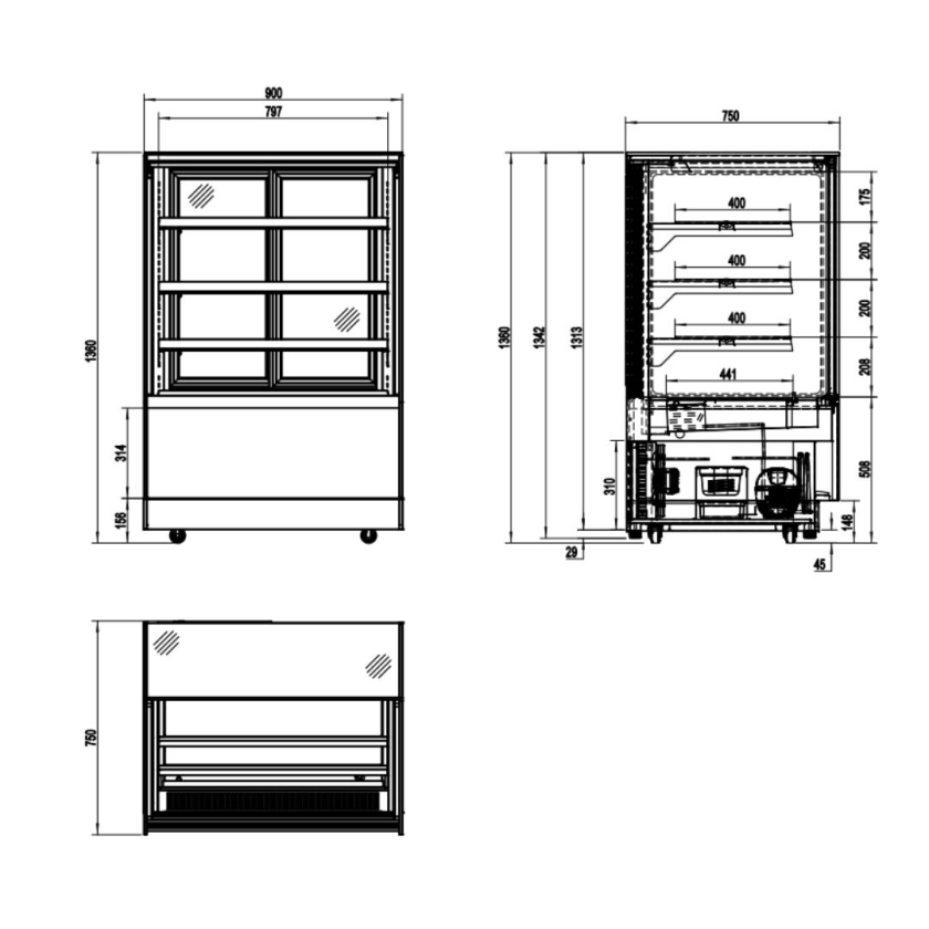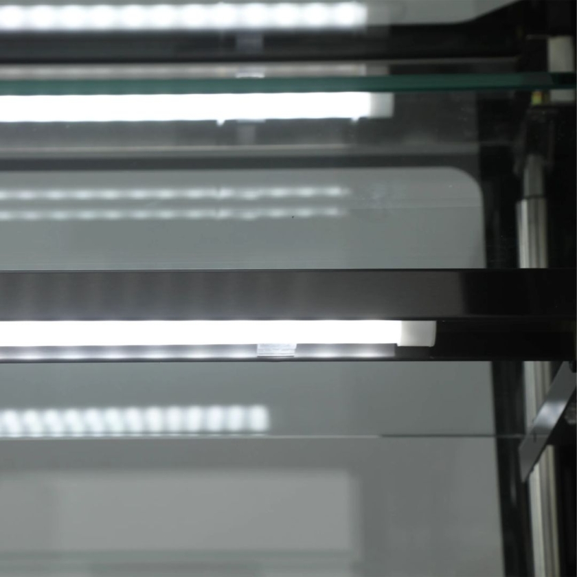 Avec sa finition noire, ses étagères en verre et son éclairage LED dans la partie supérieure de l'appareil ainsi que sous chaque étagère, il offre un design élégant et une présentation soignée des produits. Le comptoir est équipé d'un système de refroidissement ventilé efficace et d'une classe de température 3M1, garantissant que les aliments, les pâtisseries et les gâteaux sont conservés dans des conditions optimales. Sa plage de température entre -1 et +5 °C est facile à régler sur le contrôleur numérique.