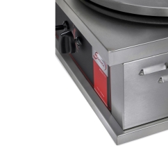Cette crêpière électrique Ø40cm dispose d'une plaque en fonte de 12 mm offrant une forte accumulation de la chaleur et ainsi des économies d'énergie. La pâte n'attache pas la plaque microssillonnée de haute qualité. Équipée de brûleur à 8 branches, elle est déale pour une utilisation intensive.