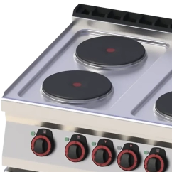 Ce fourneau professionnel électrique est doté de de 4 bruleurs vous permettant de cuire plusieurs préparations simultanément. Son four statique en dessous est compatible GN2/1. Construit avec un revêtement inox AISI 430 et la plaque supérieure en inox AISI 304, ce fourneau est très robuste et facile à nettoyer.