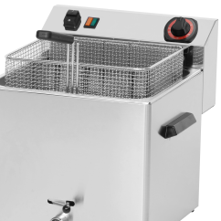 Cette friteuse électrique triphasée de 11 litres est idéale pour les établissements proposant des frites. Elle possède une zone froide pour prolonger la durée de vie de l'huile, est fabriquée en inox et est facilement transportable grâce à ses poignées. Elle dispose également d'une vanne de vidange et d'un thermostat pour ajuster la température.