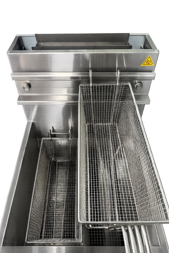 Cette friteuse est livrée avec 2 demi-paniers américains (140 × 330 × 140 mm) dotés de poignées ergonomiques en silicone, ainsi qu’un couvercle, une tige à décrocher, une grille de fond et un tuyau de vidange. Pour faciliter l’installation et la manutention, elle est équipée de 2 roulettes arrière et de 2 pieds réglables à l’avant.