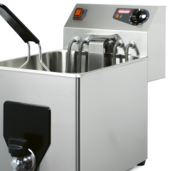Équipée d'une tête amovible ainsi que d'une cuve avec zone froide, cette friteuse triphasée de 8 litres est facile à nettoyer et la durée de vie de votre huile est prolongée. Elle dispose également d'un thermostat réglable de 50-180ºC, d'un thermostat de sécurité à réarmement manuel et d'un système de sécurité.