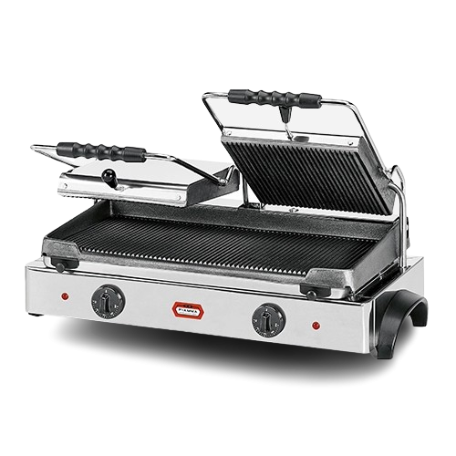 Ce grill panini professionnel possède des plaques lisses à la fois en haut et en bas, garantissant une répartition uniforme de la chaleur. Sa structure en acier inoxydable assure robustesse et nettoyage facile.
