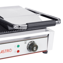 Fabriqué en acier inoxydable, ce grill panini fait preuve d'une grande robustesse. La poignée est ergonomique et résiste à la chaleur. Cet appareil a été fabriqué pour être rentabilisé rapidement. La plaque rainurée de cette machine panini permet de marquer facilement votre produit, elle est donc idéale pour les paninis mais pas seulement ! La machine à panini est très polyvalente, vous pouvez en servir pour cuire du poisson, de la viande, des légumes, des sandwiches, des toasts, des croque-monsieurs...