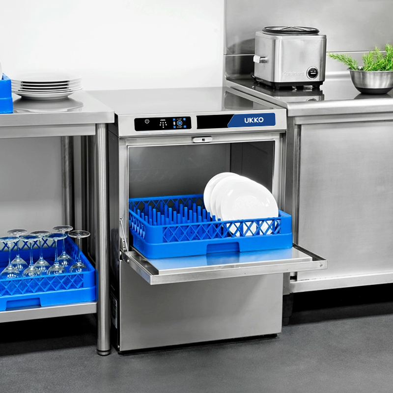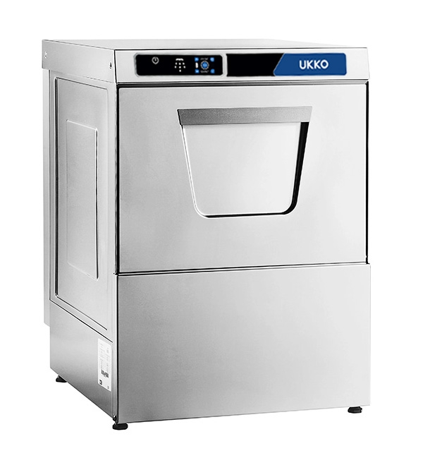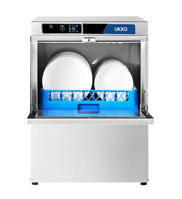 Le lave-vaisselle est doté de doseurs péristaltiques intégrés pour le produit de lavage et de rinçage, et est fourni avec 2 paniers 50x50 (1 pour assiettes et 1 pour plats), 1 godet à couverts, ainsi que les flexibles d'arrivée d'eau, d'évacuation et le câble d'alimentation.