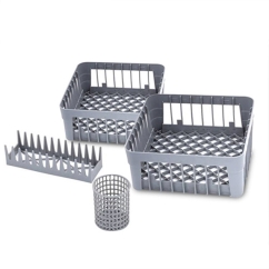 Ce lave-verre professionnel est livré avec 1 doseur de produit de rinçage (péristaltique), 2 paniers à verres 35x35, 1 godet à couverts, 1 support à soucoupes et les flexibles d'arrivée d'eau et d'évacuation.