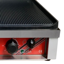 Le rabat supérieur est articulé et les deux plaques sont rainurées pour un meilleur marquage de vos tacos. Les poignées sont ergonomiques et résistantes à la chaleur.