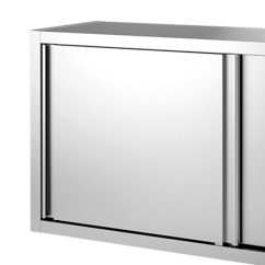 Équipé de deux portes coulissantes, ce meuble mural en acier inoxydable alimentaire est très pratique à l’usage. Pour plus de confort d’utilisation et pour faciliter l’aménagement, il est livré avec une étagère intermédiaire à bords pincés réglable en hauteur.