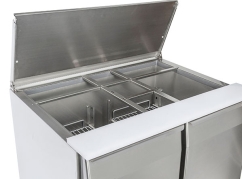 Avec son thermostat digital réglez facilement la température avec précision. Doté d'un brise-thermique anti-condensation plastique comme cadre qui évite les pertes de froid et assure une température constante dans la saladette. Un bac de récupération d'eau en plastique séparé est présent pour éviter les fuites.