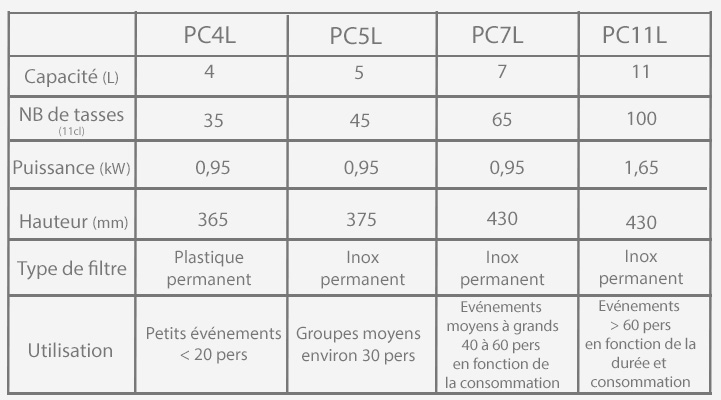 Ci-dessous un tableau récapitulatif des principaux litrages des percolateurs :