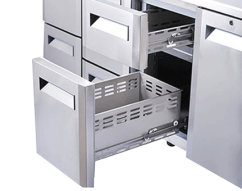 Les tiroirs donnent un accès facile aux produits. Prolongement de votre saladette à poser, vous pouvez y stocker les aliments que vous utilisez plus rarement. C’est également la solution la plus rapide pour changer vos bacs GN et pour limiter l’encombrement dans la cuisine. Attention, la place gagnée par l’usage des tiroirs réduit l’espace de stockage du meuble réfrigéré.
