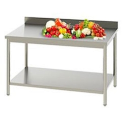 La Table inox adossée est sensiblement similaire à la précédente catégorie, elle dispose cependant d'un dosseret d'environ 100 mm de hauteur. La table à dosseret est souvent placée contre un mur, le renfort en inox permet alors de limiter les écoulements le long du mur et les éclaboussures