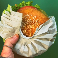 Cet emballage permet de déguster le burger sans avoir à l'enlever de son emballage. Plus de contact direct avec le produit. Cela évite de se salir les doigts. Tous les éventuels déchets tombent directement dans le fond de votre emballage.