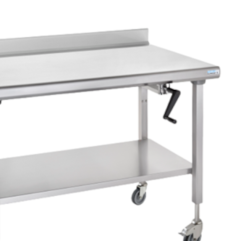 Ce plan de travail à hauteur réglable est équipé d'une manivelle à actionner manuellement, vous permettant de monter ou descendre le plateau en fonction de chaque besoin. Ergonomique, il vous suffit de replier la manivelle sous le plan de travail afin d'éviter tous risques d'accrochage ou de chocs. Dotée d'une pompe robuste et de 4 roues de qualité, cette table adossée est parfaitement stable et se déplace très facilement.