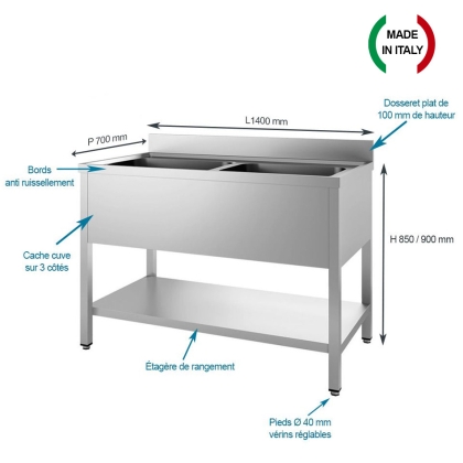 Cette plonge en acier inoxydable alimentaire résiste aux rayures et autres agressions pouvant provenir du frottement de vos équipements. Avec ses 700 mm de profondeur, pour 1400 de longueur et 900 de hauteur, elle s’adapte parfaitement à votre espace et à vos besoins.
