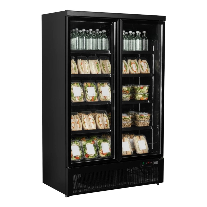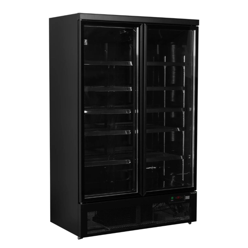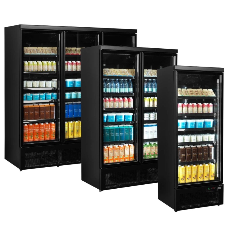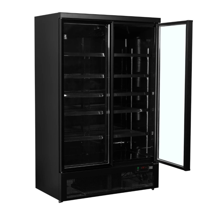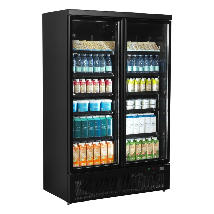 Pensée pour les espaces de vente à fort débit, cette vitrine réfrigérée de 809 litres permet d’exposer une grande quantité de produits tout en facilitant leur accès. Sa finition noire, à l’intérieur comme à l’extérieur, met naturellement en valeur les produits. La plage de température de -1 à +10 °C permet de s’adapter à différents types de produits, du frais au prêt-à-consommer. Les 2 portes vitrées permettent aux clients de visualiser les produits sans ouvrir systématiquement, ce qui réduit les pertes de froid. Leur fermeture automatique évite également les oublis, un vrai avantage en libre-service.