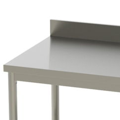 Le plan de travail est composé d’un plateau en inox renforcé par un panneau en bois insonorisé et hydrofuge de 18 mm d’épaisseur. Il comporte également un dosseret de 100 mm et les bords sont tombés de 40 mm avec rebords pincés. La table est montée sur 4 pieds carrés de 40 mm de large.