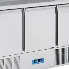 L'espace réfrigéré de cette table de préparation est fermé par 3 portes battantes équipées d'une serrure de série. Les clayettes amovibles intérieures vous permettent d'organiser facilement et confortablement votre espace de stockage. La saladette intégrée supérieure peut accueillir jusqu'à 8 bacs GN 1/6 et offre un disponibilité des produits idéale pour des dressage rapides.