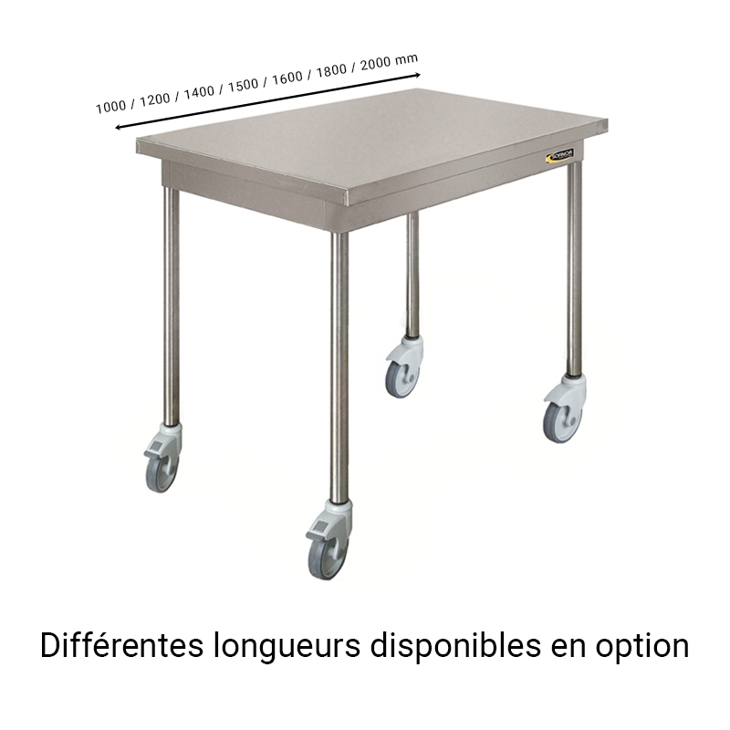 Pour répondre à toutes vos contraintes elle est disponible de 1000 mm jusqu’à 2000 mm de largeur. Les pieds sur roulettes s’emboîtent dans les bandeaux inox pour un montage simple et rapide sans outil.