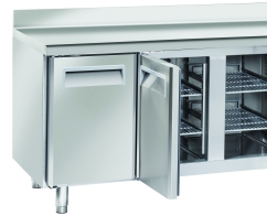 Cette table réfrigérée positive à dosseret combine plan de travail inox fonctionnel et un espace de stockage réfrigéré de 400L, ce qui la rend parfaite pour la préparation rapide de vos plats.