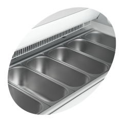 Le couvercle relevable offre un accès facile à la crème glacée pour le vendeur et peut être utilisé simultanément par deux personnes. Ce modèle peut contenir jusqu'à 9 bacs Napoli de 5L (non fournis) avec une capacité de stockage en dessous pouvant aller jusqu'à 16 bacs de 5L.