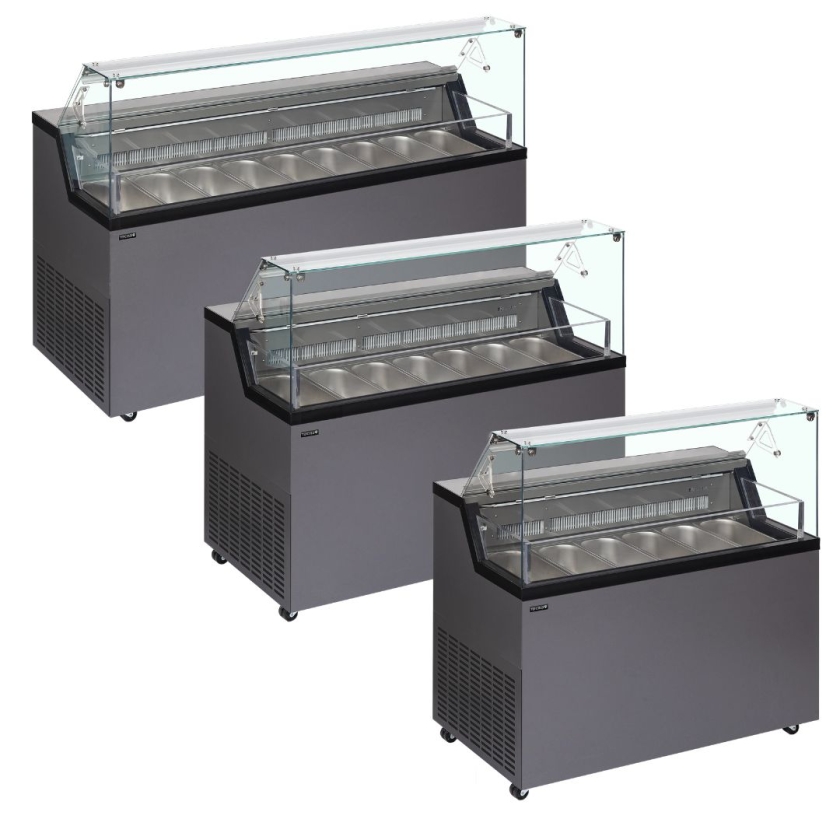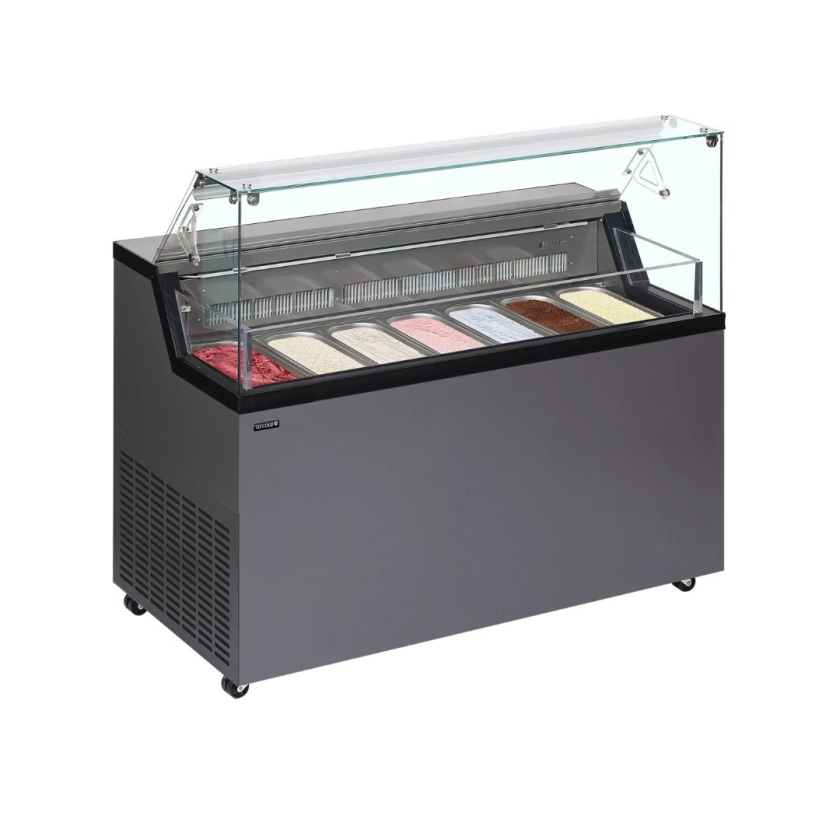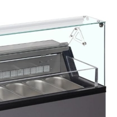 Grâce à son dessus vitré plat et au positionnement surélevé des bacs, les glaces restent parfaitement visibles pour les clients, même à distance, notamment pour les enfants. L’éclairage intérieur LED avec interrupteur met en valeur les parfums et améliore la présentation des produits. Le couvercle arrière relevable facilite l’accès aux bacs et permet un service simultané par deux personnes. Un compartiment de rangement facilement accessible permet de garder les accessoires à portée de main, tandis que les 4 roulettes assurent un déplacement simple de la vitrine.