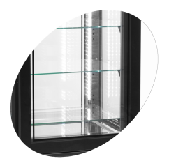 Les quatre faces vitrées, l'éclairage LED vertical et la porte vitrée à charnières présentent les produits de manière attrayante. Ce comptoir est livré avec 5 tablettes en verre et 4 roulettes, dont 2 avec freins, pour faciliter les déplacements.